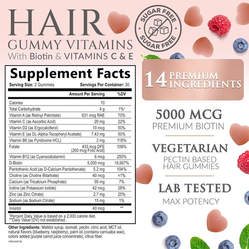 View full detailsSugar Free Hair Vitamins Gummies with Biotin 5000 mcg, Vitamin A, B12, C, D, E, Folic Acid, Supports Hair Growth Gummy, Vegetarian Friendly, Supports Strong Beautiful Hair and Nails - 60 Gummies