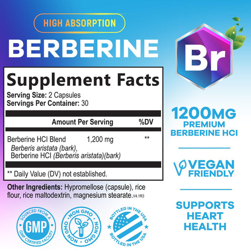 View full detailsBerberine HCL 1200mg Supplement - Berberine HCI Capsules High Absorption Supplement for Heart Health & Immune Support, High Strength, Gluten-Free, Vegan, Non-GMO Pills - 120 Veggie Capsules