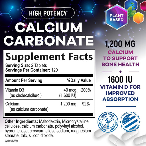 View full detailsCalcium Supplement with Vitamin D - 1200 mg Calcium Carbonate with 1600 IU of D3 Vitamins - Supports Bone Strength, Teeth & Immune System - Natural & Easily Absorbable for Women & Men - 120 Tablets