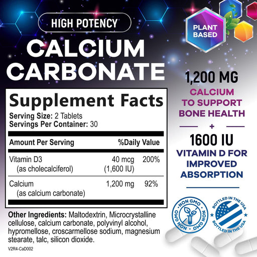 View full detailsCalcium Supplement with Vitamin D - 1200 mg Calcium Carbonate with 1600 IU of D3 Vitamins - Supports Bone Strength, Teeth & Immune System - Natural & Easily Absorbable for Women & Men - 60 Tablets