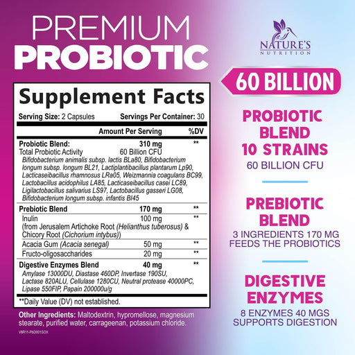 Nature's NutritionSupport your digestive health with our premium 60 Billion CFU Probiotic, expertly formulated for both women and men. Each serving combines 10 diver...