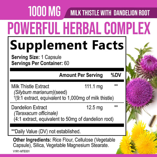 View full detailsMilk Thistle Supplement - Liver Cleanse Detox & Repair Formula 1000mg with Dandelion - Nature's Herbal Milk Thistle Extract Supplements w/Silymarin Marianum, Supports Liver Health - 60 Capsules