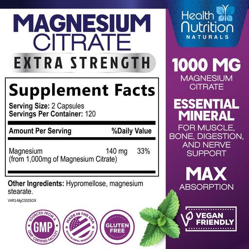 Health Nutrition NaturalsMagnesium Citrate High Potency Magnesium Citrate Capsules 1000mg - Chelated for High Absorption - bottled in the USA - Best Bowel Supplement that S...