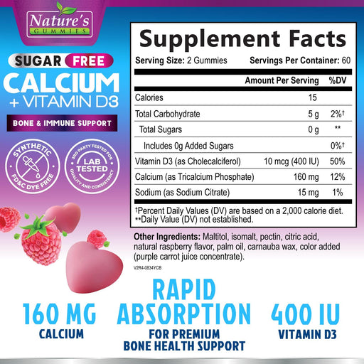 Nature's GummiesSugar Free Chewable Calcium Gummy Vitamins - Plus 400 IU Vitamin D3 for Bone, Teeth, & Immune Health Support - Calcium Supplements for Women &a...