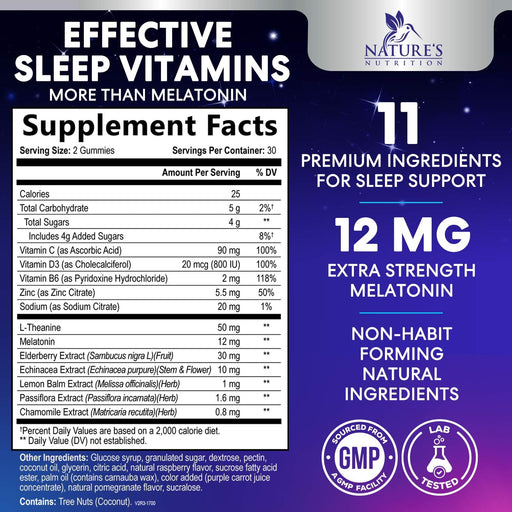 Nature's NutritionEnjoy nighttime sleep support with our delicious Raspberry flavored Sleep Gummies, featuring 12mg of melatonin per serving for extra strength suppo...