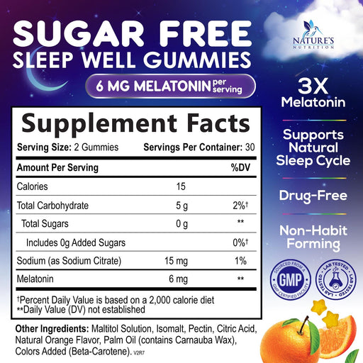 Nature's NutritionEnjoy nighttime sleep support with our delicious Sugar Free Sleep Gummies, featuring 6mg of melatonin per serving for extra strength support.These ...