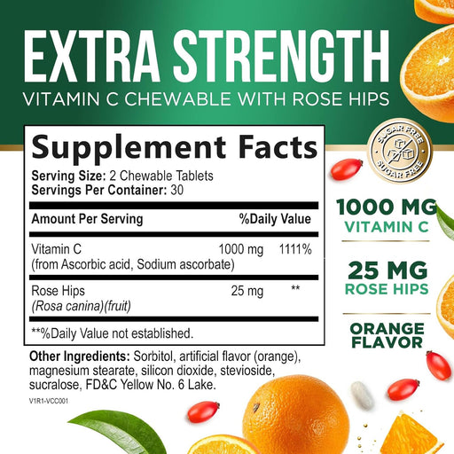 Vitamin C Chewable 1000mg - Extra Strength Antioxidants for Powerful Immune Support w/Vitamin C & Rose HIPS - Potent Dietary VIT C Chews Supplement, Natural, Vegan, Gluten-Free, Non-GMO - 60 Tablets