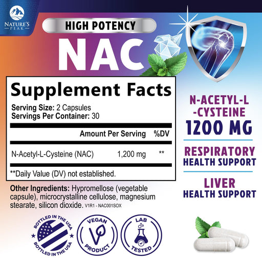Nature's PeakNAC Supplement N-Acetyl Cysteine 1200 mg - Supports Lung & Liver Health - Immune Support with Powerful Antioxidants to Fight Free Radicals - Ea...